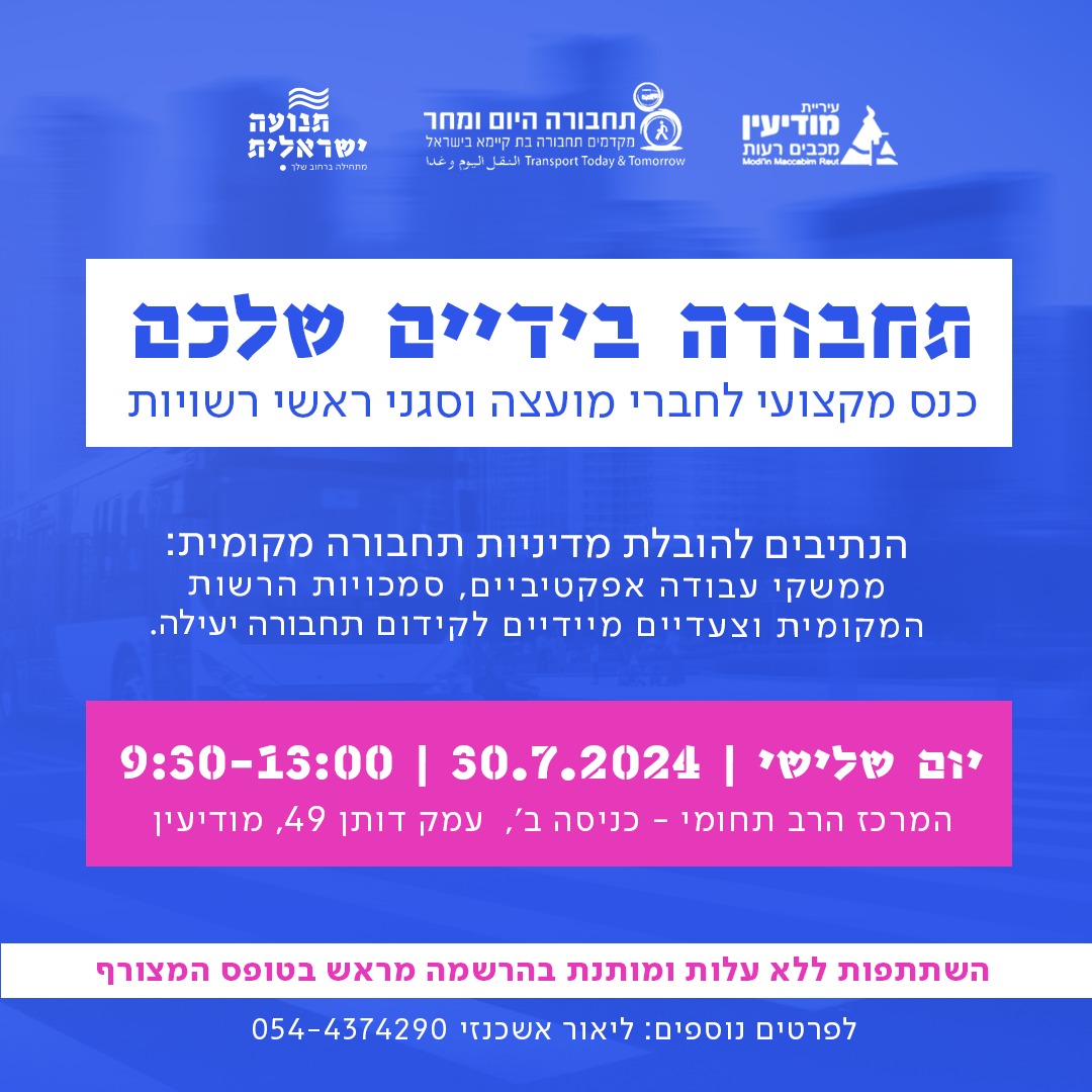 ‘תנועה ישראלית’, ‘תחבורה היום ומחר’ ועיריית מודיעין מכבים רעות מזמינות קובעי מדיניות ברשויות המקומיות לכנס שיעסוק בתחבורה בעת חירום, תחבורה ציבורית חשמלית וממשקי עבודה בין שלטון מרכזי לשלטון מקומי ועוד.
