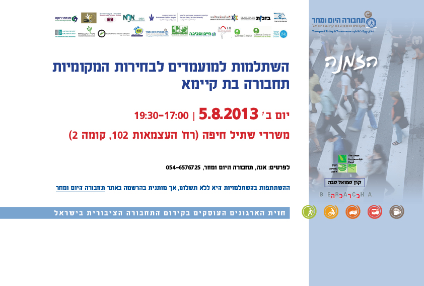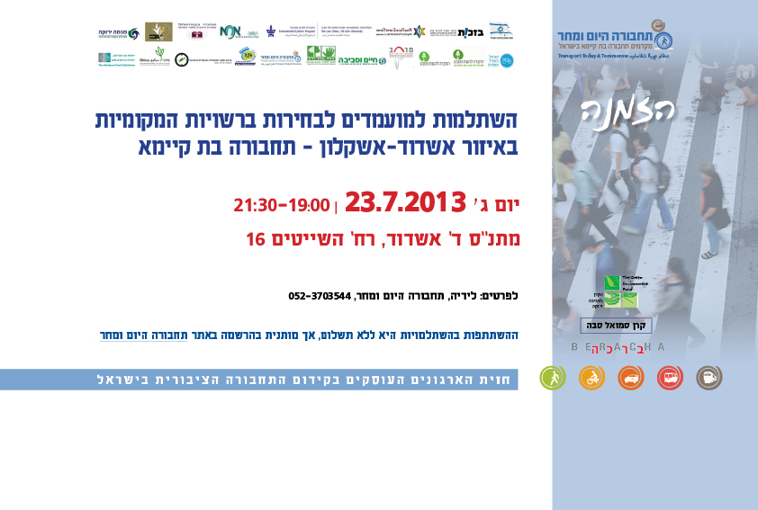השתלמות בקידום תחבורה בת קיימא למועמדים בבחירות לרשויות המקומיות – אשדוד-אשקלוןלקראת הבחירות לרשויות המקומיות פועל פורום ארגוני תחבורה לקידום המודעות והמחויבות של נציגי הרשימות לקידום תחבורה בת קיימא. ביום ג' ה-23.7 נקיים את ההשתלמות השנייה למועמדים (הפעם מאיזור אשדוד-אשקלון והדרום) שבה יוצגו למשתתפים סוגיות שונות בתחבורה בת קיימא כגון נגישות לבעלי מוגבלויות, תחבורה ציבורית, תשתיות הליכה ואופניים.